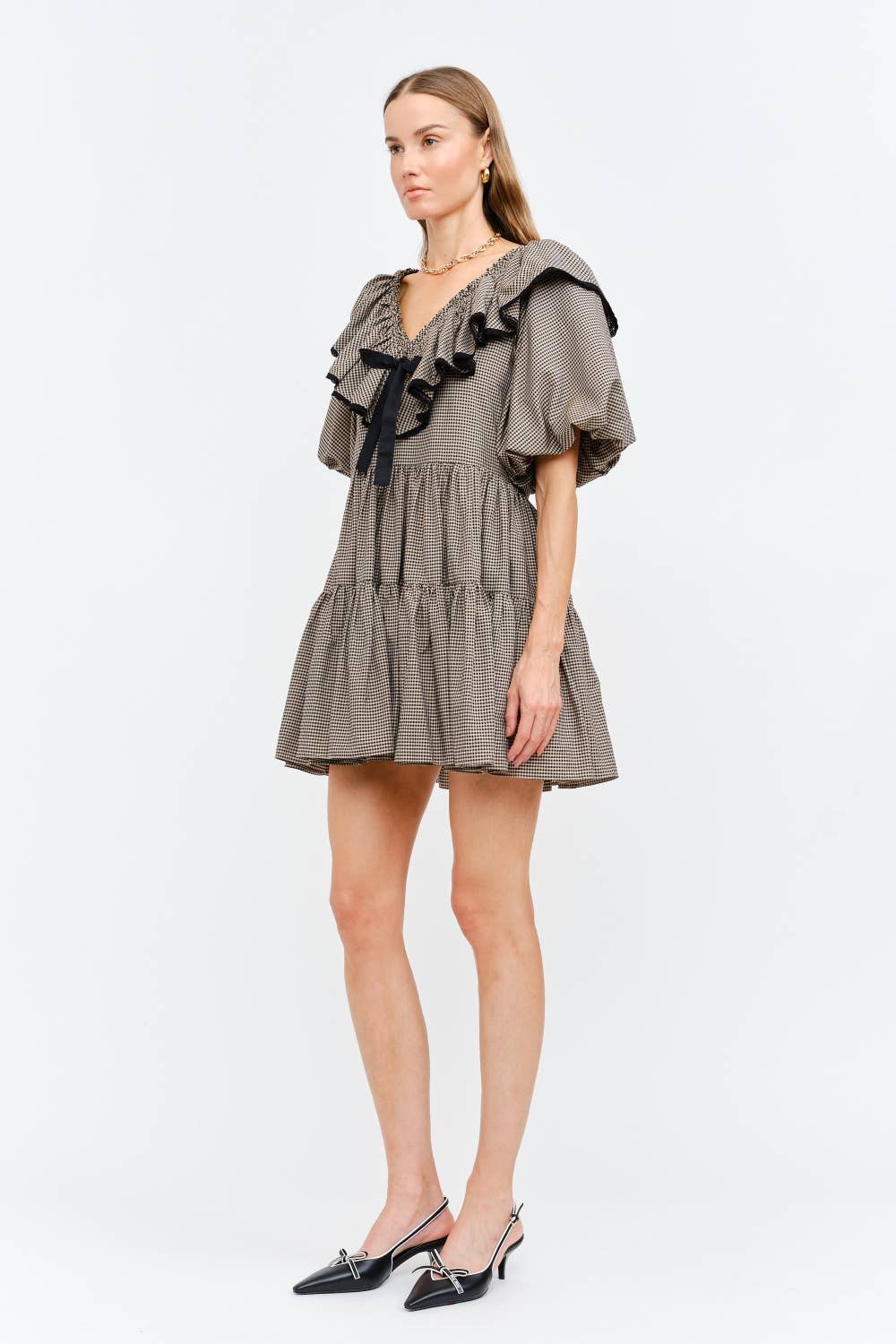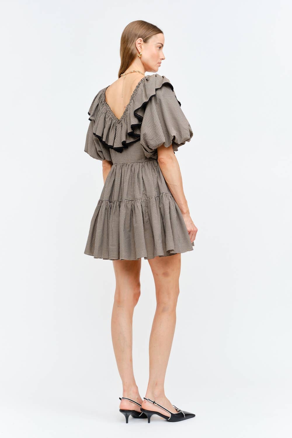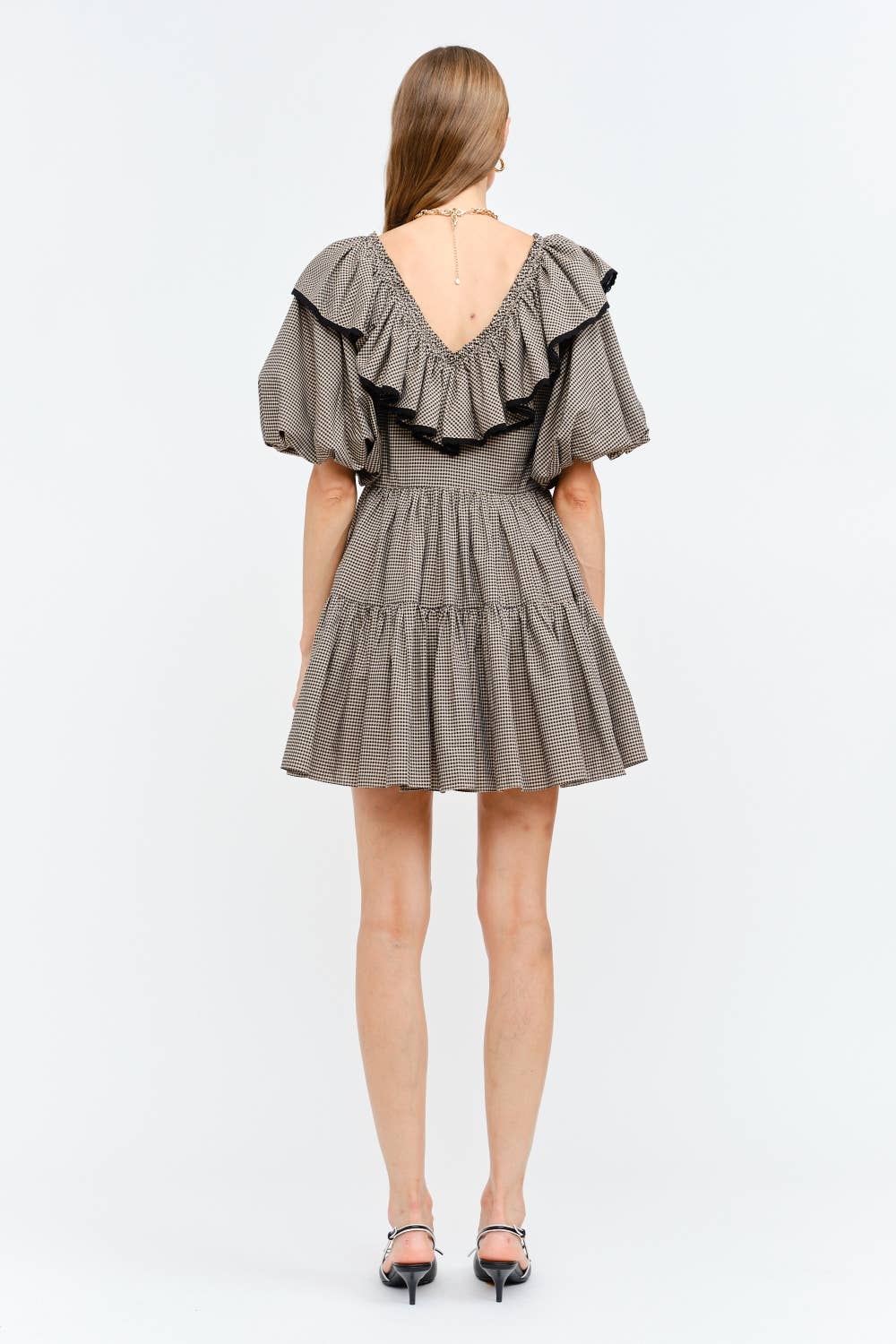 The Austi Gingham Dress is a charming gingham mini dress that embodies a vintage twist. Its classic babydoll silhouette is elevated with playful volume and dramatic ruffle detailing along the neckline and back. Puff sleeves and a tiered skirt add even more whimsy, while a sweet grosgrain bow adds a romantic touch. With a V-neckline and double ruffle trim, this dress also features a contrasting grosgrain bow at the front, short puff sleeves with a gathered hem, and a mini length. The elasticized edge of the V-back completes the look.