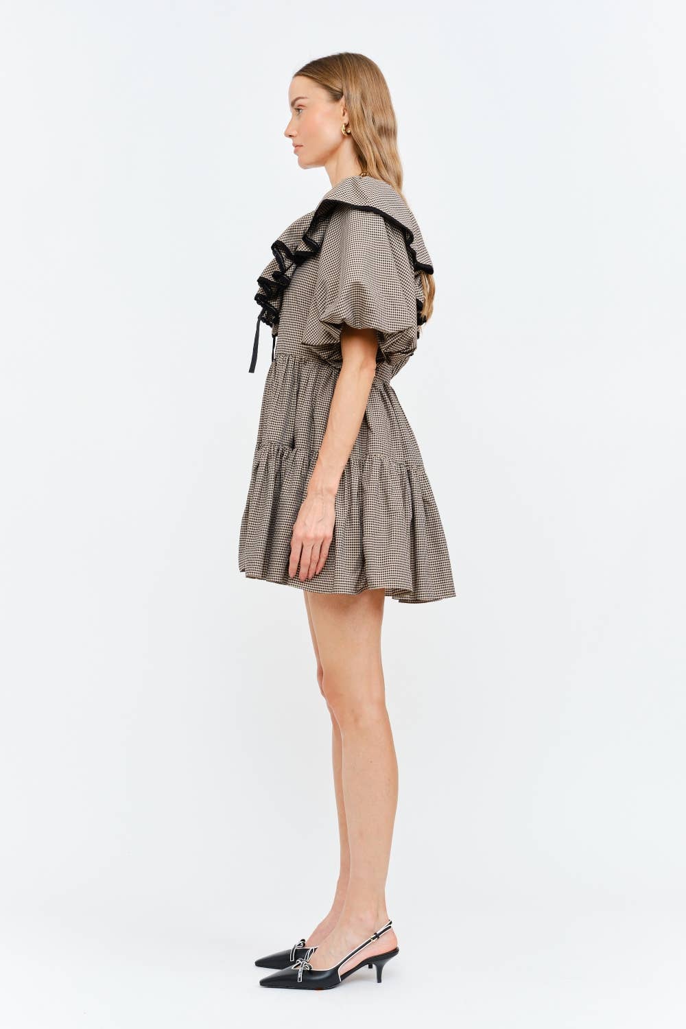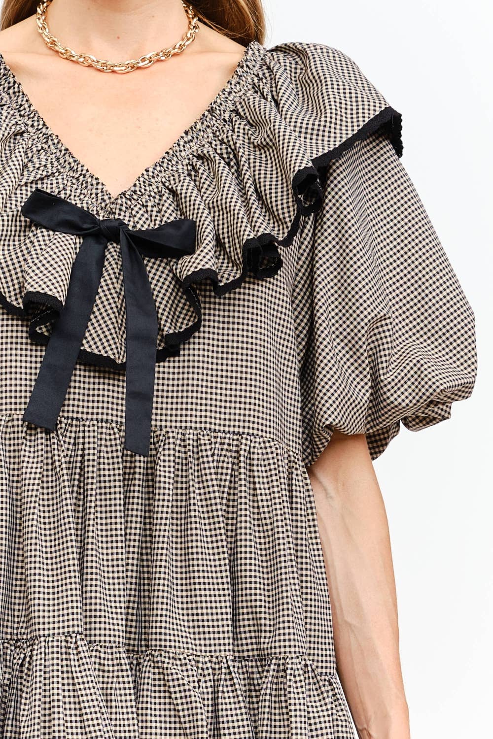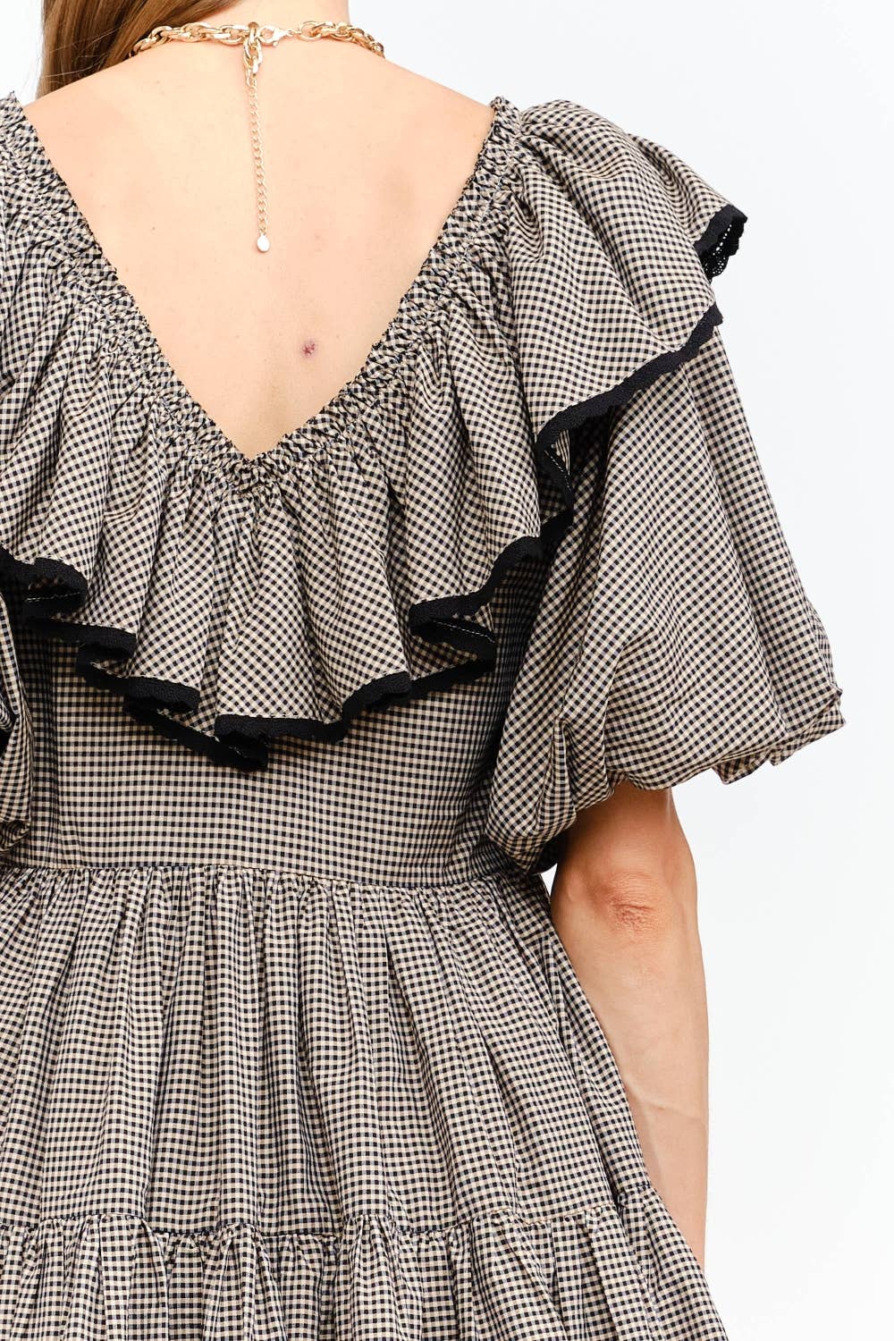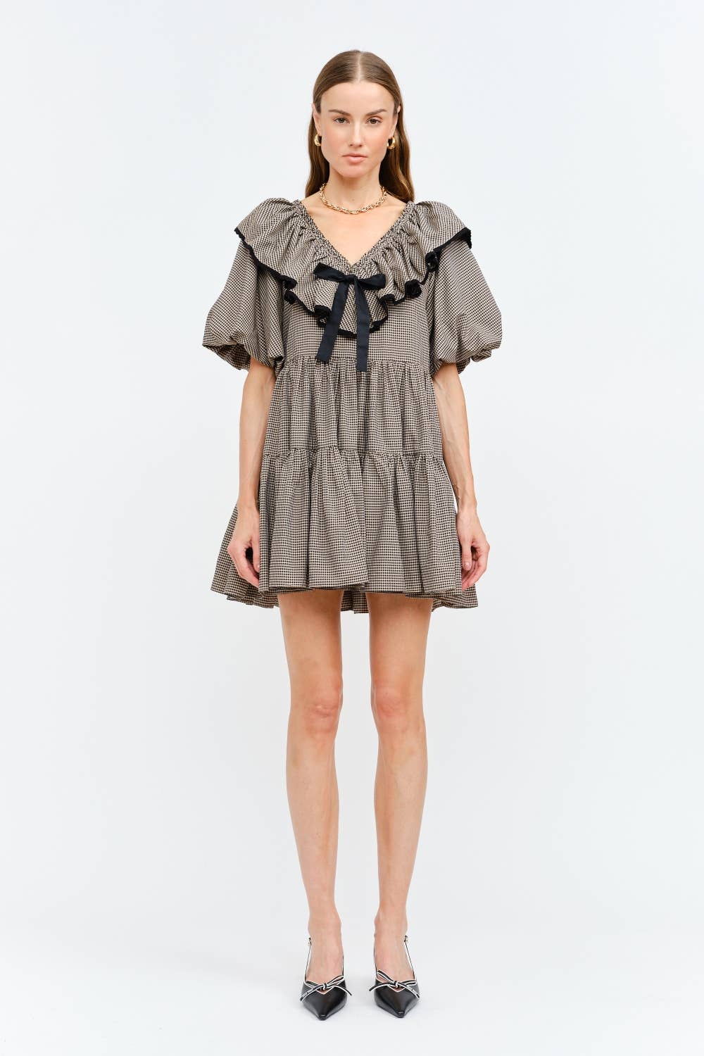 The Austi Gingham Dress is a charming gingham mini dress that embodies a vintage twist. Its classic babydoll silhouette is elevated with playful volume and dramatic ruffle detailing along the neckline and back. Puff sleeves and a tiered skirt add even more whimsy, while a sweet grosgrain bow adds a romantic touch. With a V-neckline and double ruffle trim, this dress also features a contrasting grosgrain bow at the front, short puff sleeves with a gathered hem, and a mini length. The elasticized edge of the V-back completes the look.