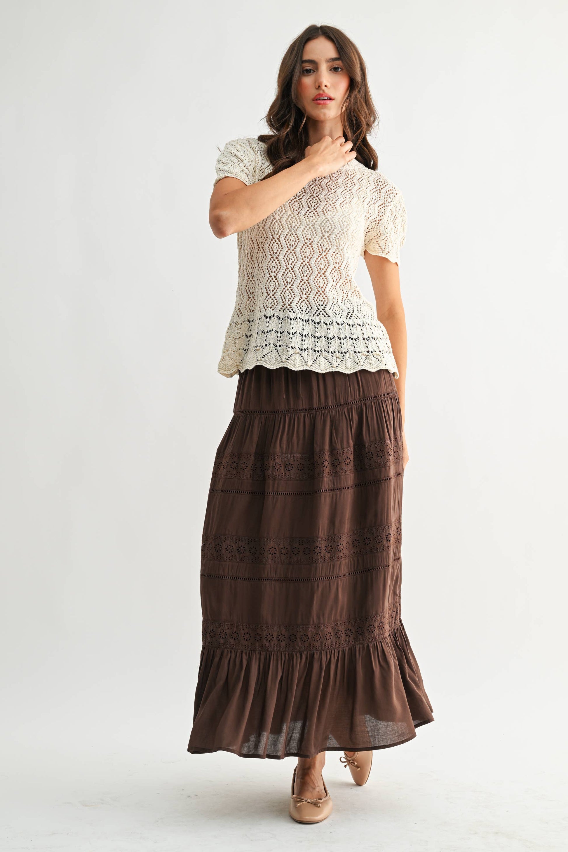 The Jessy Maxi Skirt effortlessly blends style and comfort, showcasing a graceful tiered design adorned with exquisite eyelet lace accents. Available in a deep chocolate brown shade, it boasts an adjustable drawstring elastic waistband for the perfect fit. Whether you pair it with a classic tank or a chic bohemian blouse, this skirt flows seamlessly with your every movement, making it a fantastic choice for casual outings or laid-back weekends.