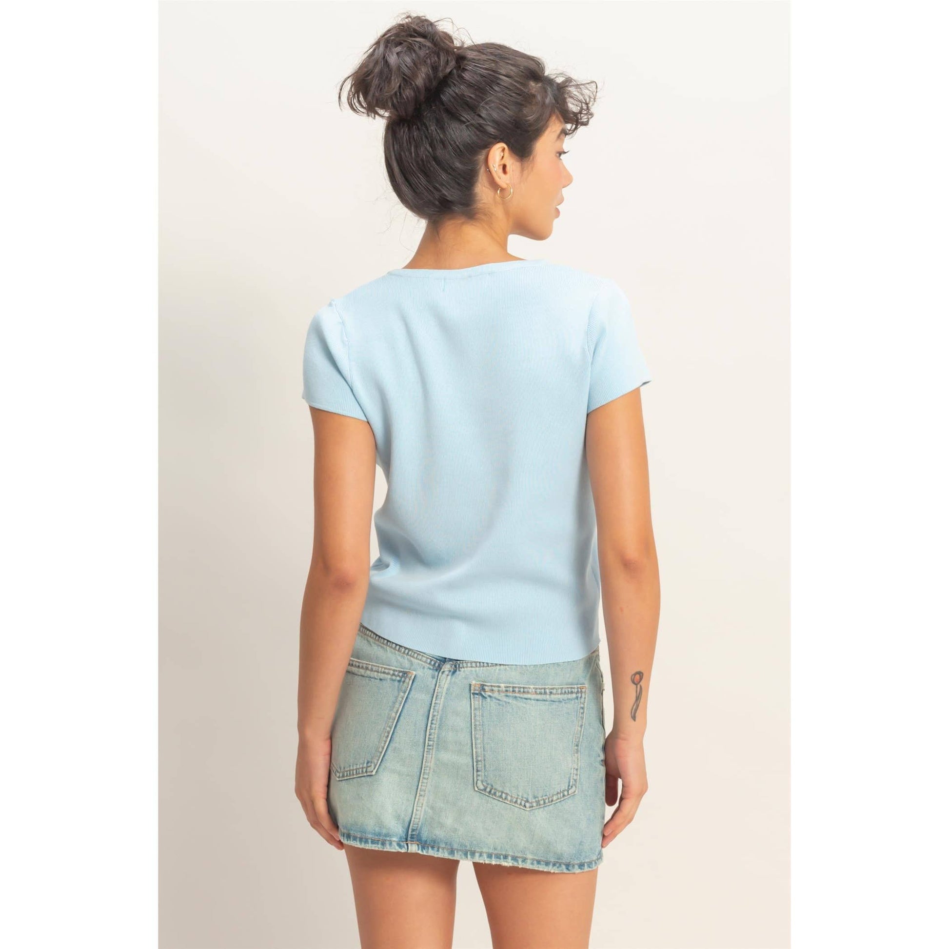 This top is crafted from stretched knit and features a classic round neckline, tailored short sleeves and a full front button placket. Cut in a true-to-size fitted silhouette, this top can be styled with high-waisted jeans and sleek sneakers for a relaxed look.