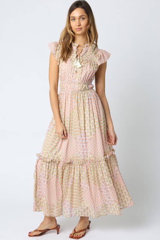 Our Lani Maxi Dress features a ruffled hem and an adjustable strap.