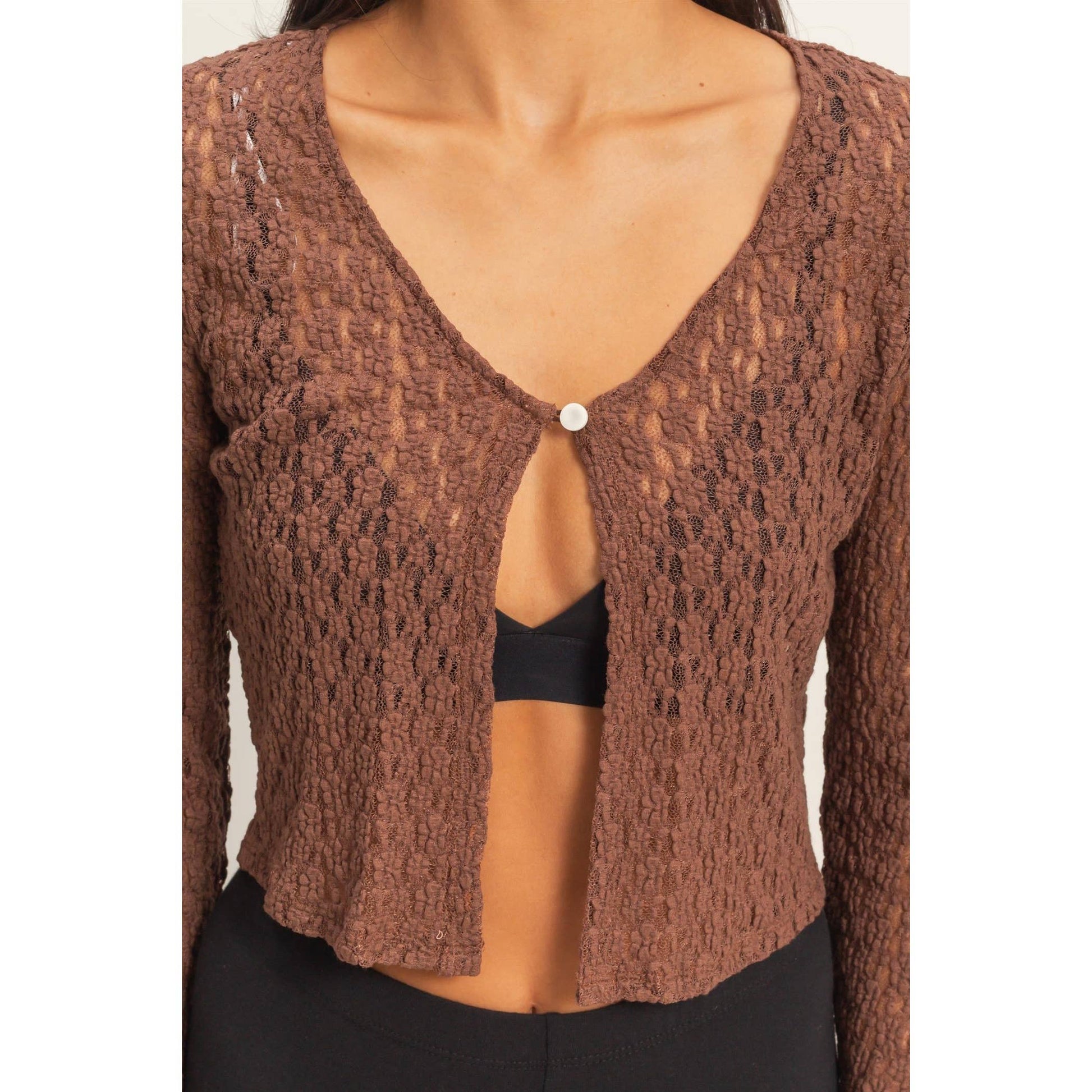 Crafted from sheer stretch lace knit, this cardigan top has an all-over floral pattern with a wide V-neckline, and long, fitted sleeves. Closure is a single pearl shank button with an elastic loop. The cut is a snug fitted, cropped silhouette with a subtle, delicate hemline. Pair with high-waisted satin trousers or a fitted camisole for a chic look.